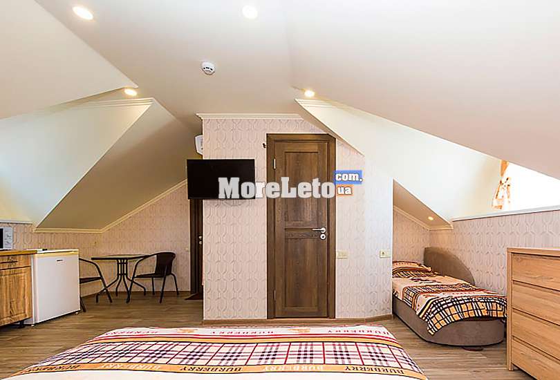 Двоповерховий котедж, розрахований на 4-6 осіб. Дві окремі спальні, кухня-студія, вона ж і їдальня, обладнана посудом та побутовими приладами необхідними для приготування їжі. Місткість 4-6 осіб.